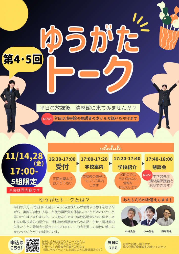 放課後の少人数相談会として「ゆうがたトーク」を実施しております。 大好評の第1,2回に引き続き第3回を10/10(金)に行います。 お申し込みの枠が残りわずかとなりました。 ★清林館に興味がある!★実 …
